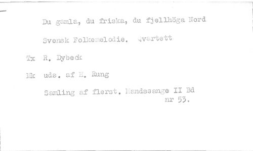//// Du gamla, du friska, du fjelihöga Nord //// Svensk Folkemelodie. Tx R, Dybeck //// iIL uds, af h. Rung //// Sanling af flerst. Landssange II Bd //// nr 53. ////