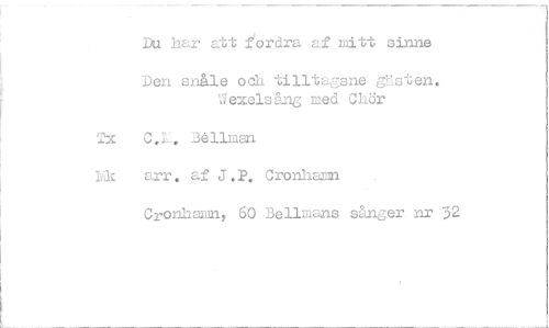 //// Du har att fordra af mitt sinne //// Den snåle och tilltagsne gsten. Wexelsåns med Chör //// Tx C.L. Bellman //// Lilc arr, af J.P. 0ronhamn //// Cronhamn, 60 Bellmans sånger nr 32 ////