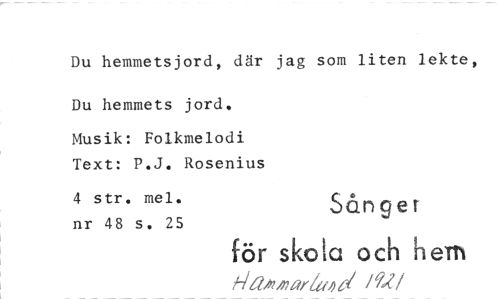 //// Du hemmetsjord, där jag som liten lekte, Du hemmets jord. //// Musik: Folkmelodi Text: P.J. Rosenius //// 4 str. mel. nr 48 s. 25 Sånger //// för skola och hem fr1amk,,arbi4d /9;0. ////
