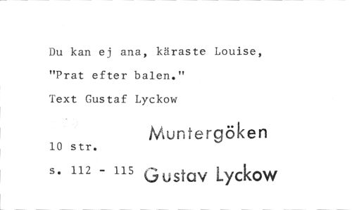 //// Du kan ej ana, käraste Louise, "Prat efter balen." Text Gustaf Lyckow //// 10 str. Muntergöken //// s. 112 - 115 Gustav Lyckow ////