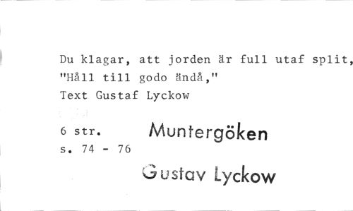 //// Du klagar, att jorden är full utaf split, "Håll till godo ändå," Text Gustaf Lyckow //// 6 str. Muntergöken //// s. 74 - 76 //// L3ustav Lyckow ////