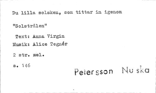 //// Du lilla solsken, som tittar in igenom "Solstrålen" //// Text: Anna Virgin Musik: Alice Tegndr //// 2 str. mel. s. 146 //// Pe er sso n u ska ////
