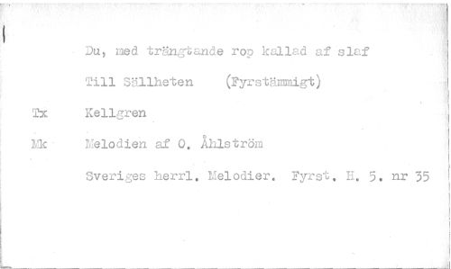 //// Du, med trängtande rop kallad af slaf //// Till Sällheten (Fyrstämmigt) //// Tx Kellgren //// kk Lelodien af U. Åhlström //// Sveriges herrl, Melodier. Fyrst. H. 5. nr 35 ////