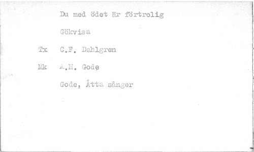 //// Du med ödet är förtrolig //// Gökvisa //// Tx C.F. Dahlgren //// A.H. Gode //// Gode, Åtta sånger ////