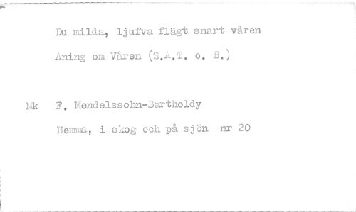 //// Du milda, ljufVa flägt snart våren //// Aning om Våren (S.A.2. o. B.) //// läk P. Dendelssohn,Bartholdy //// Hem a,i skog och på sjön nr 20 ////