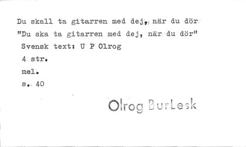 //// Du skall ta gitarren med dej', när du dör "Du ska ta gitarren med dej, när du dör" Svensk text: U P Olrog //// 4 str. //// mal. //// s. 40 //// 0 roa //// 4 1. ////