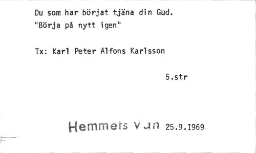 //// Du som har börjat tjäna din Gud. "Börja på nytt igen" //// Tx: Karl Peter Alfons Karlsson //// 5.str //// Hemmers vJr1 25.9.1969 ////