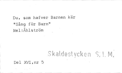 //// Du, som hafver Barnen kär "Sång för Barn" Mel:Åhlström //// Skaldestycke n S, L M, //// Del XVI,nr 5 ////
