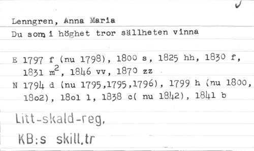 //// Lenngren, Anna Maria //// Du sorti höghet tror sällheten vinna //// E 1797 f (nu 1798), 1800 s, 1825 hh, 1830 f, 1831 /ri, 1846 vv, 1870 zz //// N 1794 d (nu 1795,1795,1796), 1799 h (nu 1800, 18o2), 1801 1, 1838 c( nu 1842), 1841 b //// Ud-Skald-feg, //// KB:s skill.tr ////