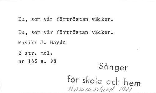 //// Du, som vår förtröstan väcker. //// Du, som vår förtröstan väcker. Musik: J. Haydn //// 2 str. mel. nr 165 s. 98 Sånger //// för skola och hem //// 4,/ a ei?-6u mbehai ////