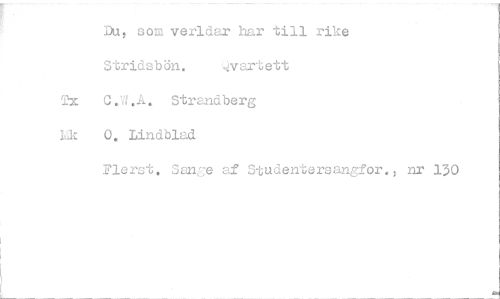 //// Du, som verldar har till rike //// Stridsbön. 'Qvartett //// lx C.W.A. Strandberg Lk 0. lindblad //// Plerst. Sange af Studentersanafor., nr 130 ////