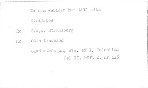 //// Du soLiverldar har till rike Stridsbön //// Tx C.. . Strandberg //// Lik Otto Lindblad //// Studentsångeni utg. af 1. edenblad Del II, häft 2, nr 116, ////