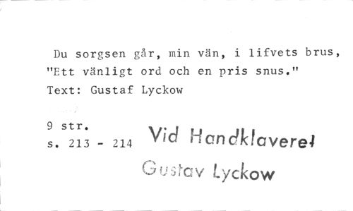 //// Du sorgsen går, min vän, i lifvets brus, "Ett vänligt ord och en pris snus." Text: Gustaf Lyckow //// 9 //// s. s213 - 214 . //// Vid Han ciklavere4 G u jittV Lyckow ////