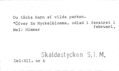 //// Du täcka barn af vilda parken, //// "Öfver En Nyckelblomma, odlad i fenstret i //// Mel: Himmer februari. //// Skaldestycken S, 1. NI. //// Del:XII, nr 6 ////