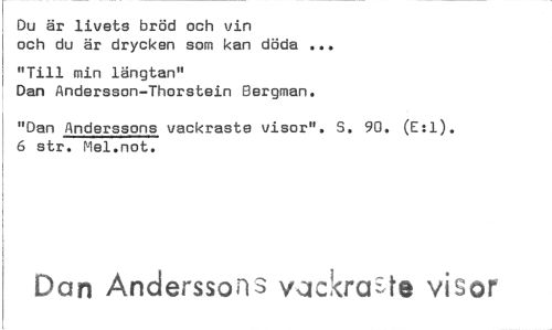 //// Du är livets bröd och vin och du är drycken som kan döda //// "Till min längtan" //// Dan Andersson-Thorstein Bergman. //// "Dan Anderssons vackraste visor". S. 90. (E:1). 6 str. Mel.not. //// Dan Anderssons vackrcrzle visor ////