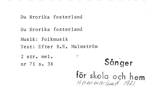 //// Du ärorika fosterland Du ärorika fosterland //// Musik: Folkmusik //// Text: Efter B.E. Malmström //// 2 str. mel. //// nr 71 s. 38 Sånger //// för skola och hem //// a -Ca 1,4 a? 7~d /9; ? //// /