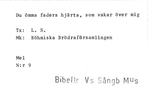 //// Du ömma faders hjärta, som vakar över mig //// Tx: L. S. //// Mk: Böhmiska Brödraförsamlingen //// Mel N:r 9 //// Bibel r Vs Sångb Mus ////