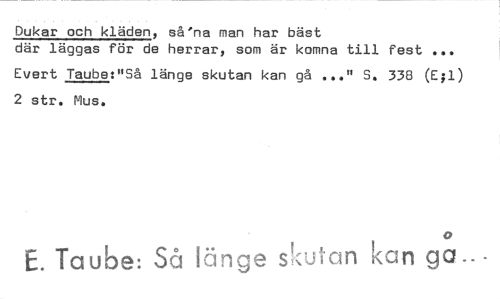//// Dukar och kläden, så'na man har bäst //// där läggas för de herrary som är komna till fest ... //// Evert Taube:"Så länge skutan kan gå ..." S. 338 (E;1) 2 str. Mus. //// 0 //// E. Taube: Så länge skutan kan ga... ////