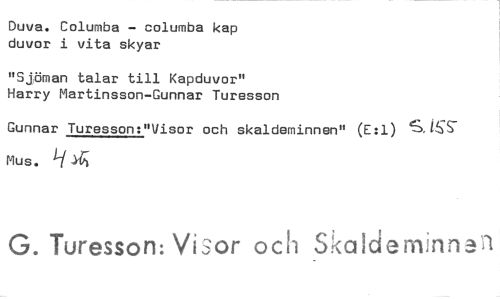 //// Duva. Columba - columba kap duvor i vita skyar //// "Sjöman talar till Kapduvor" Harry Martinsson-Gunnar Turesson //// Gunnar Turesson:"Visor och skaldeminnen" (Ed) 5,US Mus. 1-146-1 //// G. Turesson: Visor och .'>ciideniinn...a ////