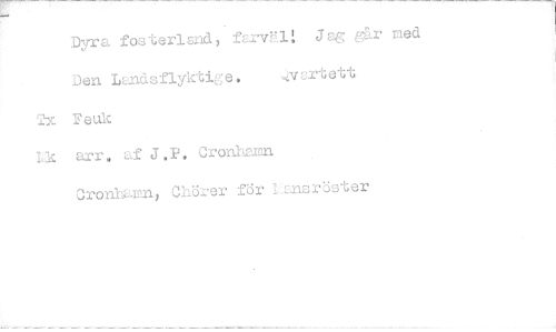 //// Dyra fosterland, farvU; Jag går med //// Den Landsflyktige. 4srartett //// Feuk //// kk arr. af J.P, Cronhamn //// Oronlmn, Chörer för I.:ensröster ////