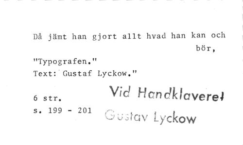 //// Då jämt han gjort allt hvad han kan och //// bör, //// "Typografen." //// Text: Gustaf Lyckow." //// 6 str. Vid Hendklaverei //// s. 199 - 201 //// Joy yckow ////