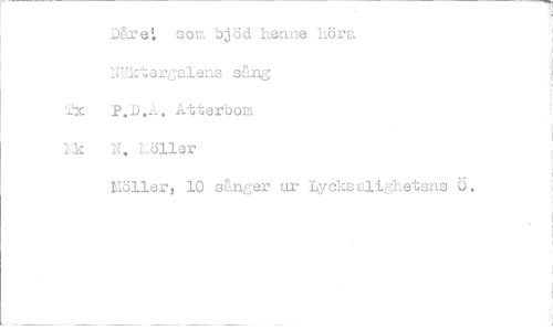 //// Dåre'. som bjöd henne höra //// NUktergalens //// 2x P.D.A. Atterbom //// hk N. Löner //// Möller, 10 sånger ur Lyokscaighetsns U. ////