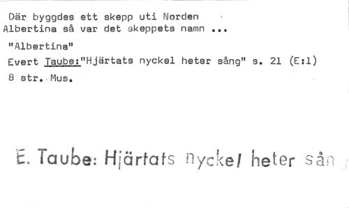 //// Där byggdes ett skepp uti Norden Albertina så var det okeppets namn • • • //// "Albertina" //// Evert Taube:"Hjärtats nyckel heter sång" s. 21 (E:1) //// 8 str.-Mus. //// E. Taube: Hjärtats nyckel heter sP, ////