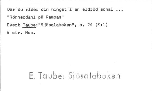 //// Där du rider din hingst i en eldröd schal ... "Rönnerdahl på Pampas" //// Evert Taube:"Sjösalaboken", s. 26 (E:1) 6 str. Mus. //// E. Taube: Ssc)aboi ////