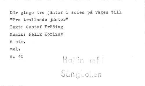 //// Där gingo tre jäntor i solen på vägen till //// "Tre trallande jäntor" //// Text: Gustaf Fröding //// Musik: Felix Körling //// 6 str. //// mel. //// s. 40 //// c , //// fl j ////