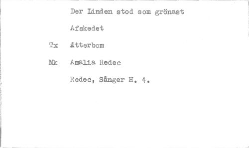 //// Der Linden stod som grönast //// Afekedet //// Tx .etterbom //// lik Amalia Redec //// Redec, Sånger H. 4. ////