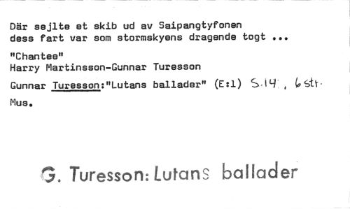 //// Där sejlte et skib ud av Saipangtyfonen dess fart var som stormskyens dragande togt //// "Chantee" //// Harry Martinsson-Gunnar Turesson //// Gunnar Turesson:"Lutans ballader" (E:1) , //// Mu. //// Turesson: Lutans ballader ////