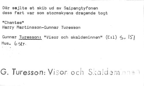 //// Där sejlte et skib ud av Saipangtyfonen dess fart var som stormskyens dragende togt //// "Chantee" //// Harry Martinsson-Gunnar Tureston //// Gunnar Turesson: "Visor och skaldeminnen" (E:1) 6, r5i //// Plus. str //// G. Turesson: Visor och S.z,3: ////