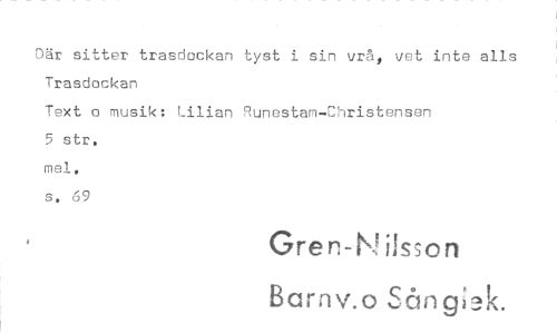 //// Där sitter trasdockan tyst i sin vrå, vet inte alls //// Trasdockan //// Text o musik: Lilian Runestam-Christensen //// 5 str. //// mel. //// s. 69 //// Gren-t\-!iisson //// Barnv.o Sån g;3k. ////