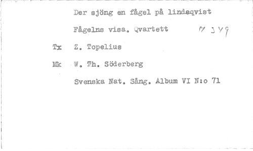 //// Der sjöng en fågel på linds4vist //// Fågelns visa. Qvartett /7 3 v //// Tx Z. Topelius //// Mk W. Th. Söderberg //// Svenska Nat. Sång. Album VI N:o 71 ////