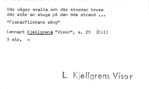 //// Där vågor svalla och där stormar brusa där står en stuga på den öde strand //// "Fiskarflickans sång" //// Lennart Kjellorent "Visor", s. 25 (E:1) //// 5 str. =IN //// 1. Kiel/grens Visor ////