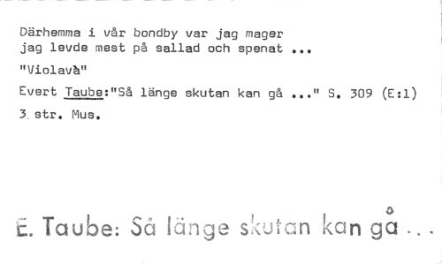 //// Därhemma i vår bondby var jag mager jag levde mest på sallad och spenat ... //// "Violavh" //// Evert Taube:"Så länge skutan kan gå ..." S. 309 (E:1) 3 str. Mus. //// e. Taube: Si Unge skutan Kan ga //// a ////