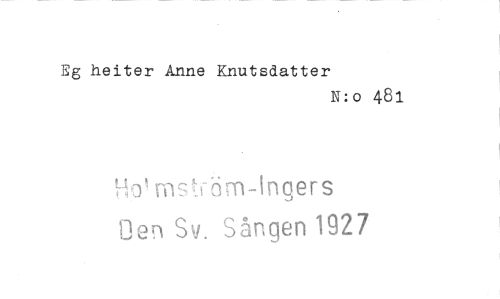 //// Eg heiter Anne Knutsdatter //// N:o 481 //// msti-eim-Ingers //// Oen Sv. Sången 1927 ////