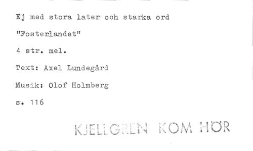 //// Ej med stora later och starka ord "Fosterlandet" //// 4 str. mel. //// Text: Axel Lundegård Musik: Olof Holmberg s. 116 //// U7i å OR //// INJL.LL LI ////