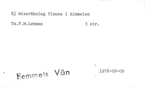//// Ej missräkning finnes i himmelen Tx.F.M.Lehman 3 str. //// Vernmeis Vän 1976-09-09 ////