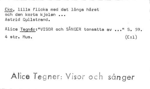 //// Eko, lilla flicka med det långa håret och den korta kjolen ... //// Astrid Gallstrand. //// Alice TeqnårtaVISOR och SÅNGER tonsatta av ...n S. 59. 4 str. Mus. (E:1) //// Alice Teg ner: Visor och sånger ////