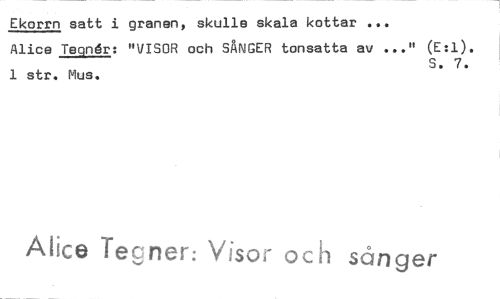 //// Ekorrn satt i granen, skulle skala kottar ... //// Alice Teondr: "VISOR och SÅNGER tonsatta av ..." (E:1). //// S. 7. //// 1 str. Mus. //// Alice 'regnen Visor och sånger ////
