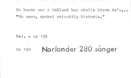//// En bonde ner i Småland han skulle härom da'n,.. "En sann, mycket svinaktig historia." //// Mel. = nr 138 //// Nr 160 Norlander 280 sånger ////