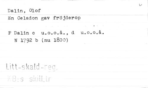//// Dalin, Olof //// En Celadon gav fröjderop //// F Dalin c u.o.o.å., d u.o.o.å. N 1792 b (nu 1800) //// Utt-skak! -or! //// 2:f) //// ‘19: Y'1Z1 //// 4• ////