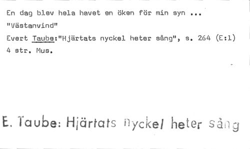 //// En dag blev hela havet en öken för min syn ... "Västanvind" //// Evert Taube:"Hjärtats nyckel heter sång", s. 264 (E:1) 4 str. Mus. //// E. Taube: Hjärtats nyckel heter sPg ////