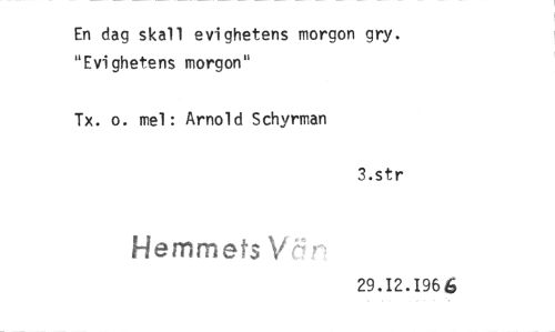 //// En dag skall evighetens morgon gry. "Evighetens morgon" //// Tx. o. mel : Arnold Schyrman //// 3.str //// Hemmets \ //// 29.12.196 6 ////