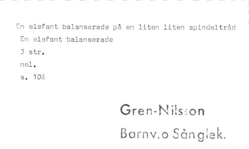 //// En elefant balanserade på en liten liten spindeltråd En elefant balanserade //// 3 str. mei. //// s. 106 //// Gren-Nilsson //// Barnv.o Sångek. ////