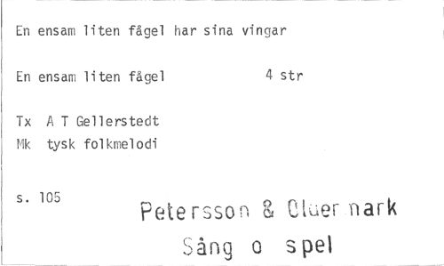 //// En ensam liten fågel har sina vingar En ensam liten fågel 4 str //// Tx A T Gellerstedt //// Mk tysk folkmelodi //// s. 105 Petersson 8 Cfter.nark //// Sång o spe' ////