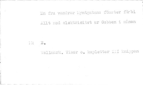 //// En fru vandrar Myntgatcno fönster förbi //// Allt nod elektricitet ur Gubben i månen //// U011mark. Visor o, kupletter ifl knippan //// L.k ////