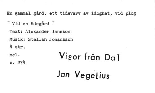 //// En gammal gård, ett tidevarv av idoghet, vid plog //// " Vid en ödegård " //// Text: Alexander Jansson Musik: Stellan Johansson 4 str. //// mel. Visor från Da 1 //// s. 274 //// Jan Vegelius ////