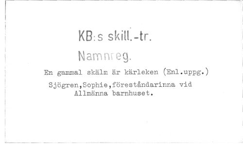 //// skill.-tr. //// Numö eg. //// En gammal skälm är kärleken (Enl.uppg.) //// Sjögren,Sophie,föreståndarinna vid Allmänna barnhuset. ////
